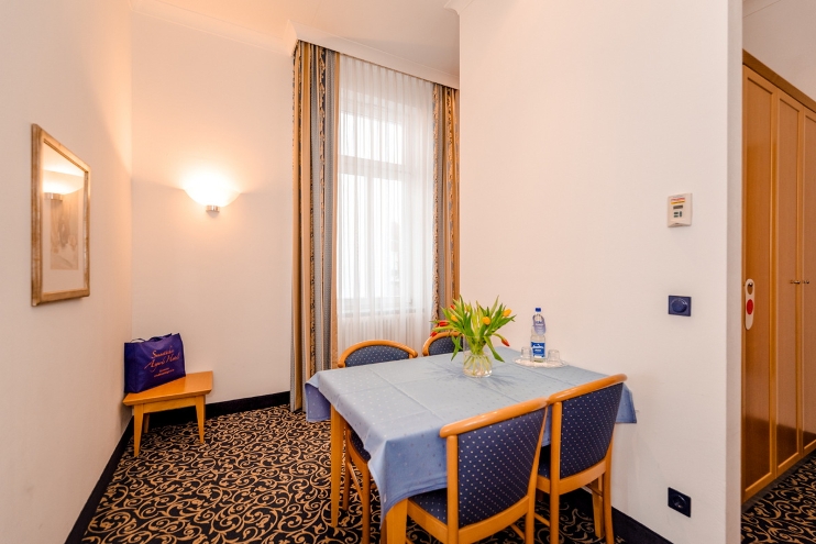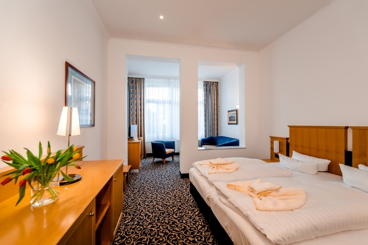 Sitzecke mit Schlafsofa, Flachbild-TV mit Radio, Telefon, Safe