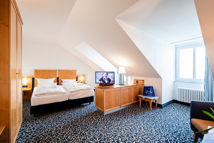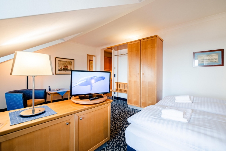 Dieses gemütliche 1-Zimmer Apartment ist zur Seeseite gerichtet und hat eine Dachschräge.