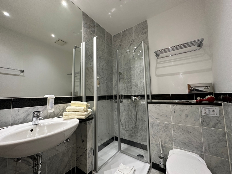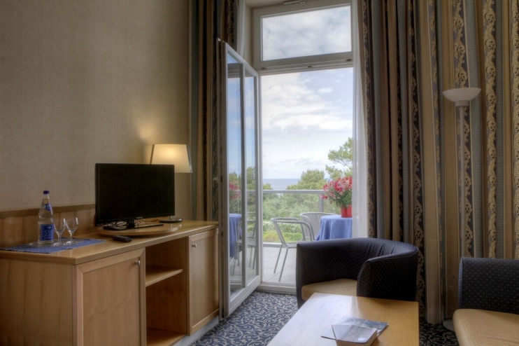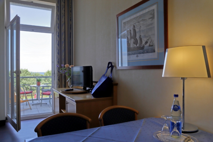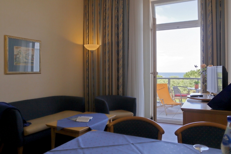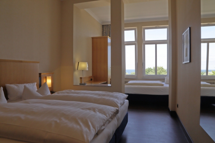 Da das Zimmer sehr wandelbar ist, können Sie wählen zwischen einem Wohnzimmer mit Sitzecke und Schlafcouch sowie einem separaten Schlafzimmer mit 4 Boxspringbetten oder einem geräumigen Wohn-Schlafzimmer mit 2 Boxspringbetten und gemütlicher Sitzecke sowie einem weiteren Schlafzimmer mit 2 Boxspringbetten. Dusche oder Wanne (bitte anfragen)