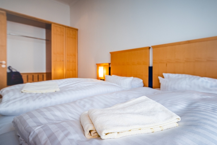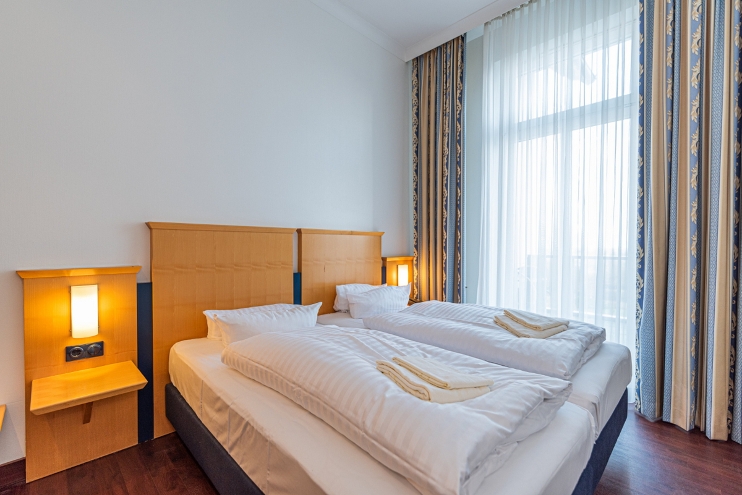 separates Schlafzimmer mit 2 modernen Boxspringbetten als Doppelbett