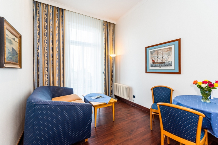 Wohnzimmer mit Sitzecke und Schlafcouch, integrierter Essplatz mit eingebauter kleiner Pantry-Küche, Flachbild-TV mit Radio, Telefon, Safe
