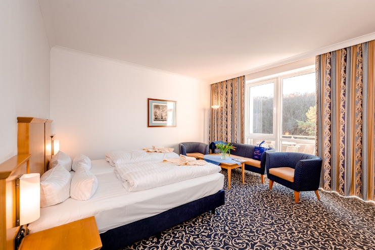 Wohn- und Schlafzimmer mit Sitzecke, integrierter Essplatz mit eingebauter kleiner Pantry-Küche, 2 moderne Boxspringbetten als Doppelbett, Flachbild-TV mit Radio, Telefon, Safe