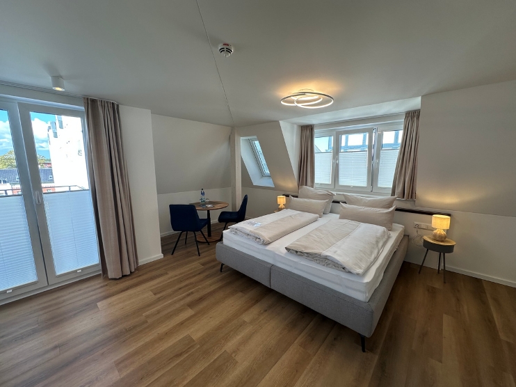 Mit dem gemütlichen Doppelbett und der kleinen Sitzgruppe werden die lichtdurchfluteten 23 m² – 29 m² des Zimmers „Doppelzimmer deluxe Balkon mit Pantryküche“ zu einem kleinen Urlaubsparadies. Ankommen, abschalten und wohlfühlen. Das Zimmer lässt sich mit einem weiteren nebenliegenden Zimmer verbinden, mit eigenem Eingang und kleinem Flur.