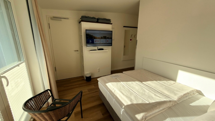 Ausstattung: Flat-TV, Telefon, Zimmersafe, kostenfreies WLAN, kleines Doppelbett, Bad mit Dusche/WC, Kosmetikspiegel, Föhn, kleine Loggia mit Sitzgelegenheit