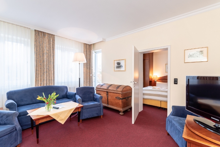 Wohnzimmer mit Sitzecke und Schlafsofa, Schlafnische mit 2 Einzelbetten, Flachbild-TV mit Radio, Telefon, Safe