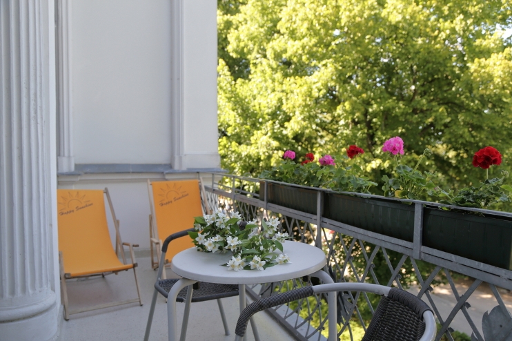 Dieses 1-Raum-Apartment hat einen großen Balkon und bietet Seeblick.